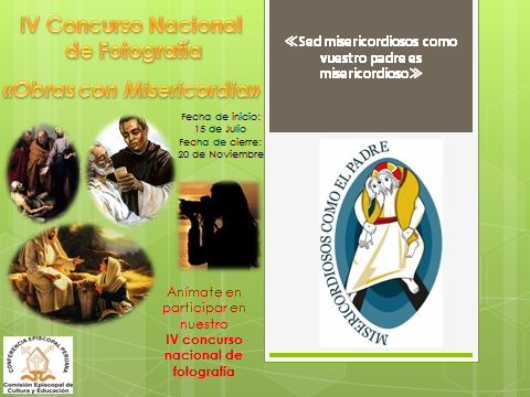 En el marco del “Año de la Misericordia”, el Área de Bienes Culturales de la Comisión Episcopal de Cultural y Educación, convoca al IV Concurso de Fotografía, que en esta edición tendrá como tema central: las Obras de Misericordia. El objetivo es fomentar el conocimiento y difusión del patrimonio cultural de la Iglesia en el Perú, mostrando imágenes referidas a las obras de misericordia.