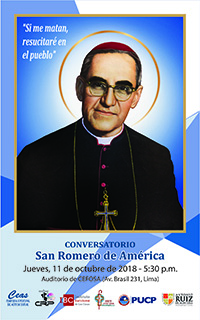 La Comisión Episcopal de Acción Social (CEAS), la Conferencia de Religiosas y Religiosos del Perú (CONFER), el Instituto Bartolomé de las Casas (IBC), el ISET Juan XXIII, la Pontificia Universidad Católica del Perú (PUCP), la Universidad Antonio Ruiz de Montoya (UARM) organizan el Conversatorio: «SAN ROMERO DE AMÉRICA», que se realizará el jueves, 11 de octubre de 2018 a las 5:30 p.m. en el Auditorio del Centro de Formación en Salud (CEFOSA), en Av. Brasil 231, Lima.