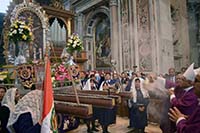 A su turno, Monseñor Vera y Monseñor García agradecieron a los fieles por haber organizado este homenaje al Señor de los Milagros, que es también ocasión para reencontrarse con los connacionales del Perú que llegan desde diversas partes de Italia. En la celebración participaron también la Embajadora del Perú ante la Santa Sede, María Elvira Velásquez y el Embajador del Perú en Italia, Luis Iberico.