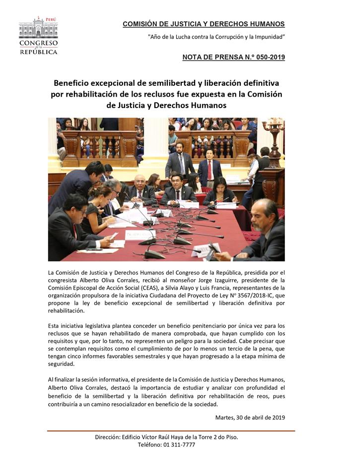 La Comisión de Justicia y Derechos Humanos del Congreso de la República, presidida por el congresista Alberto Oliva Corrales, recibió a Monseñor Jorge Izaguirre, presidente de la Comisión Episcopal de Acción Social (CEAS), a Silvia Alayo y Luis Francia, representantes de la organización propulsora de la iniciativa Ciudadana del Proyecto de Ley Nº 3567/2018-IC, que propone la ley de beneficio excepcional de semilibertad y liberación definitiva por rehabilitación.